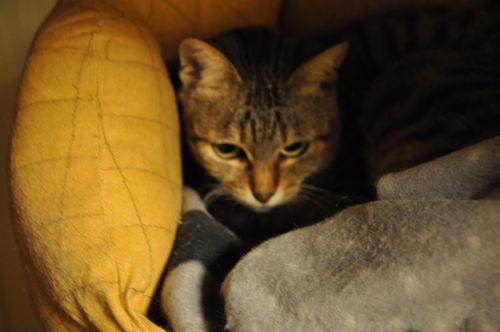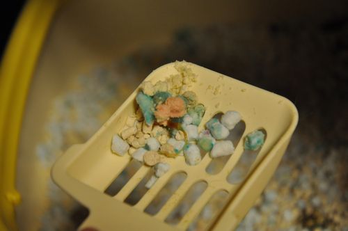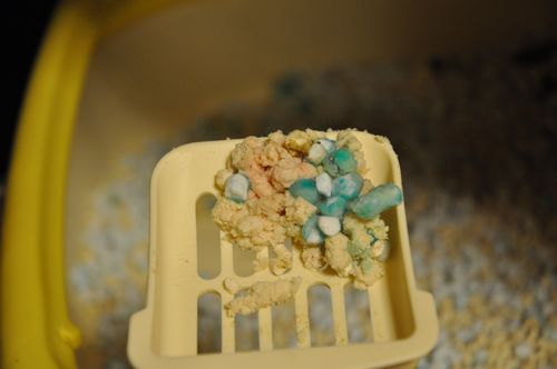 お試しで買ってみた濡れると色が変わる紙の猫砂をブレンドしています。