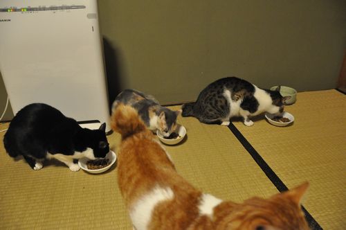ゆでささみのっけカリカリ。 みんな夢中で食べている中。