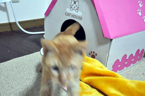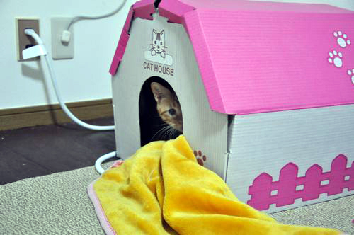 中にふかふか毛布入れれば、かなりあったか段ボール製。