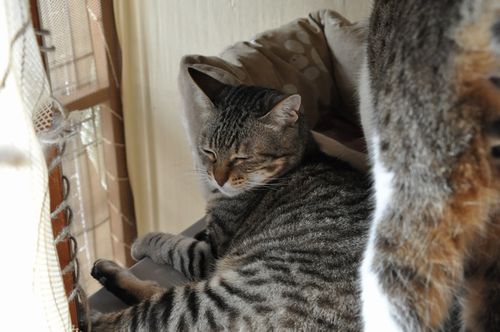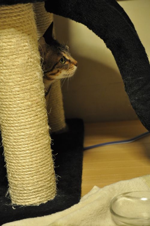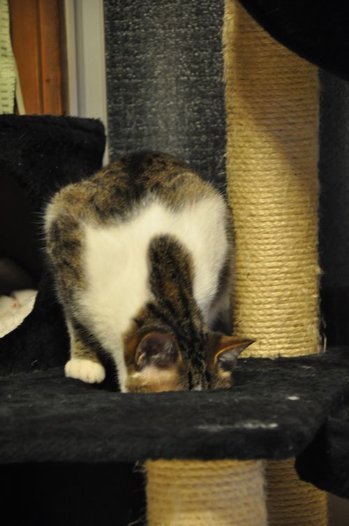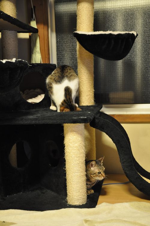 ご飯後に猫タワーの片隅でまったり過ごす。