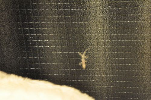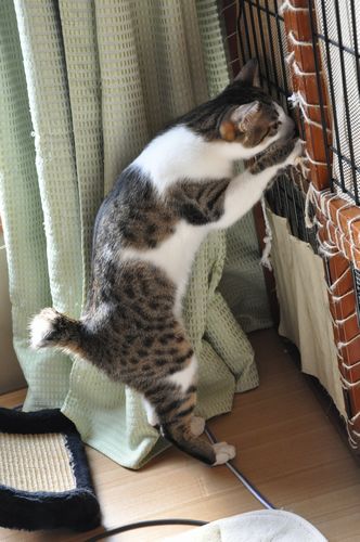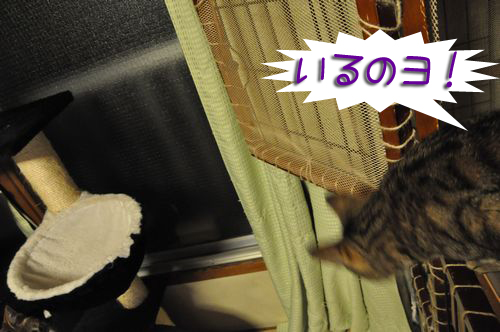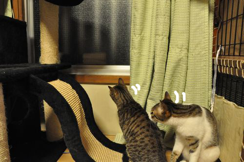 窓の向こうのイモヤモリを狙うネネちゃん。
