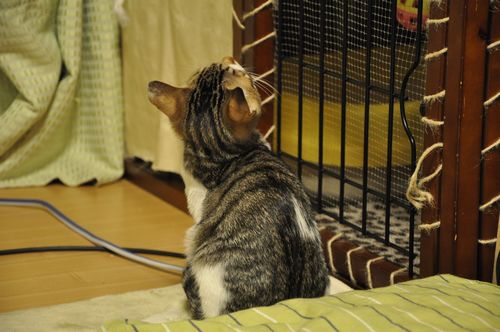 決して開かないケージを眺めるセセ。