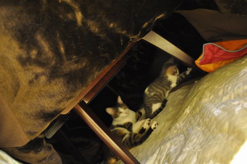 コタツにおもちゃを持ち込んで馴染みまくっている子猫と