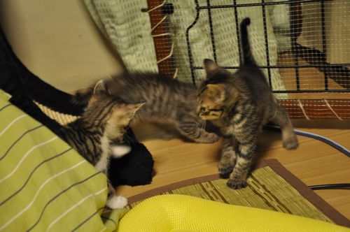 シャカシャカおもちゃの上で遊び始めるミミ&セセ